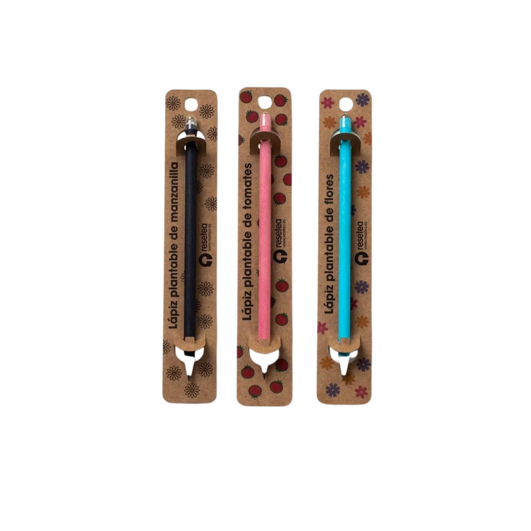 Lápiz ecológico plantable hecho con virutas reutilizadas. Cuando se gasta, se planta y brota una nueva vida. Disponible en 3 semillas naturales.